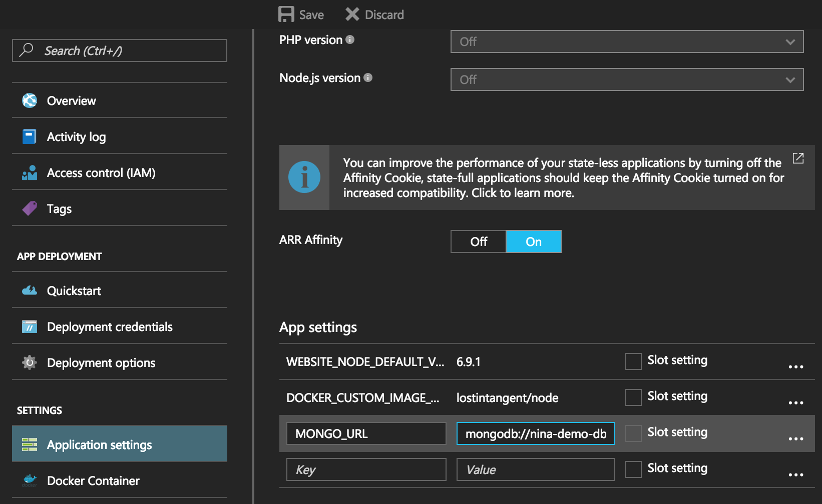 ポータル内のすべてのリソースページに戻り、以前に作成したApp Serviceインスタンスに移動します。設定セクションの下にあるアプリケーション設定メニュー項目をクリックし、アプリ設定セクションの下に新しいエントリを追加します。そのキーはMONGO_URLで、値は以前にコピーしたDocumentDB接続文字列です。