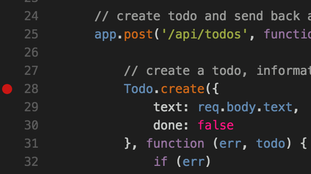 アプリが ToDo を追加しようとしたときに呼び出される Express ルートを表す 28 行目にブレークポイントを設定しましょう。ブレークポイントを設定するには、エディタ内の行番号の左側にあるガターをクリックするだけです。