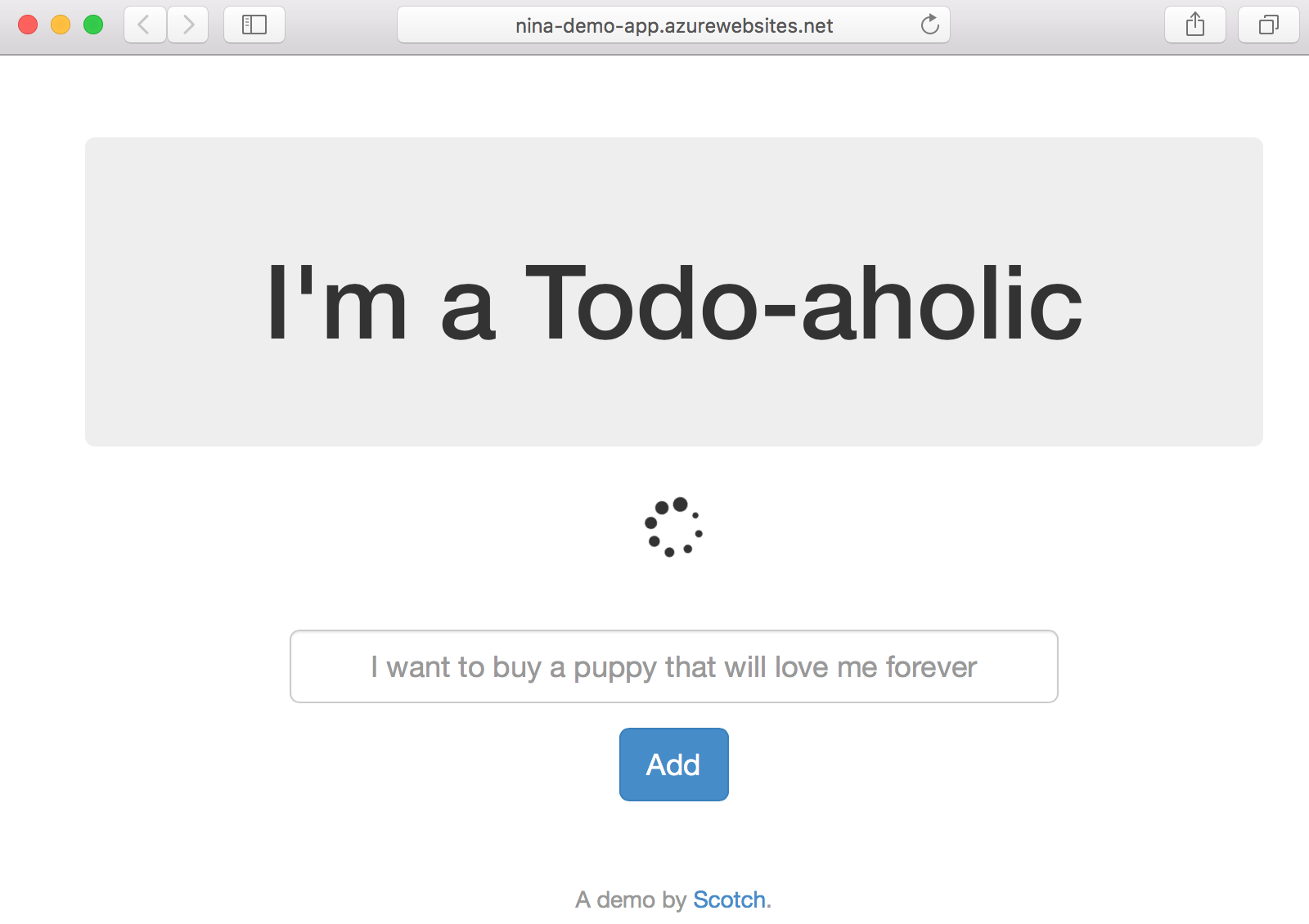 やったー!アプリをデプロイしました。しかし、回転するアイコンは、アプリがデータベースに接続できないことを示しています。これは、開発中にローカルの MongoDB インスタンスを使用していたため、Azure データセンター内からアクセスできないため当然です。幸いにも、アプリを環境変数経由で接続文字列を受け入れるように更新したため、MongoDB サーバーを起動し、App Service インスタンスがそれを参照するように再構成するだけで済みます。