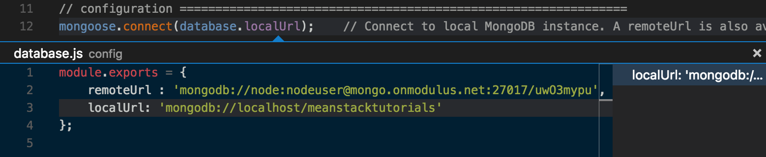 database.localUrlを右クリックして定義をピーク表示を選択すると、アプリがデフォルトで MongoDB に接続するようにどのように設定されているかを素早く確認できます。
