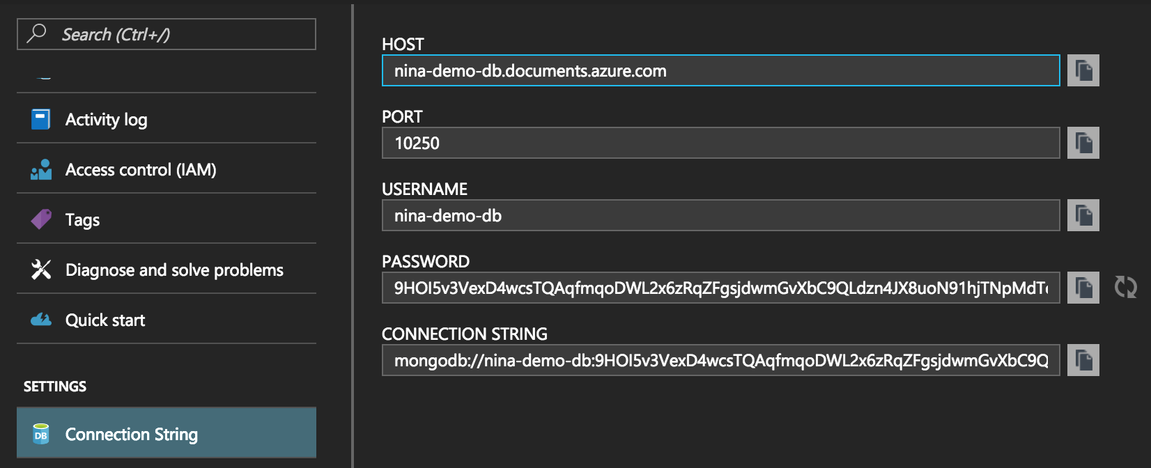 設定セクションの下にある接続文字列メニュー項目をクリックし、接続文字列フィールドの横にあるコピーボタンをクリックして、MongoDB 接続文字列をクリップボードにコピーします。