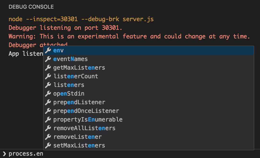さらに、このコンソールは現在実行中のアプリに実際にアタッチされているため、JavaScript の式を入力でき、アプリ内で評価され、自動補完も含まれます!たとえば、コンソールで process.env と入力して、私が何を言っているのか確認してみてください。