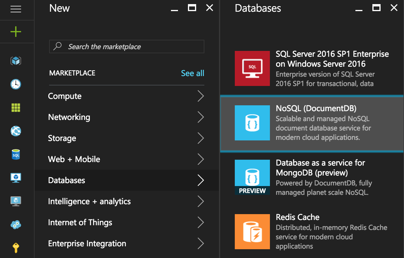 Nキーを押して新しい Azure リソースを作成し、データベース、次にNoSQL (DocumentDB)を選択します。