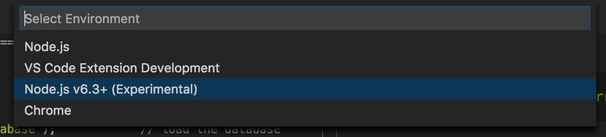 最近 Node.js に追加された新しい Chrome デバッグプロトコルサポートを使用する Node.js v6.3+ (Experimental) を選択します。これにより、プロジェクトに launch.json という新しいファイルが生成されます。これは、デバッグするためにアプリを起動またはアタッチする方法を VS Code に伝えるだけのものです。