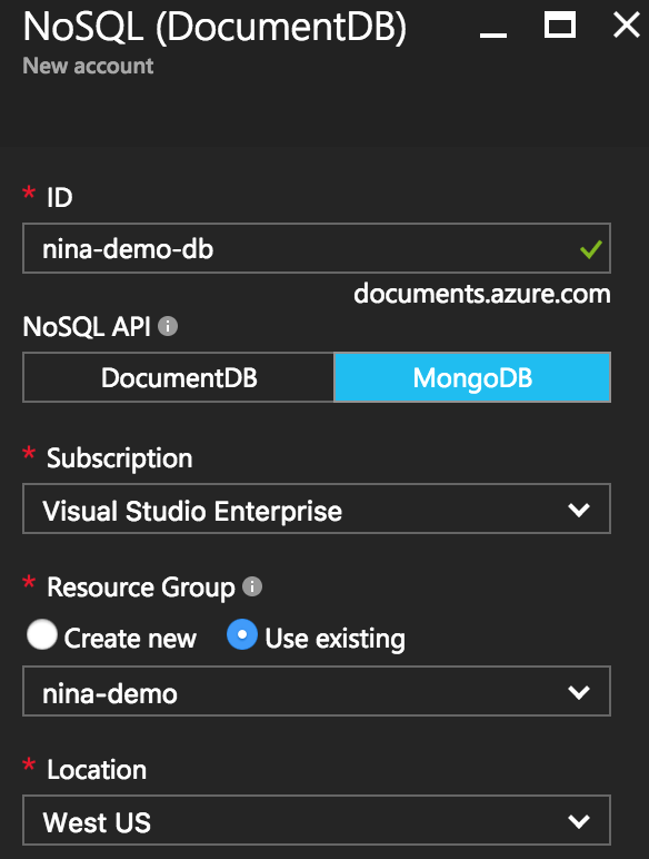 NoSQL APIをMongoDBを使用するように構成し、そのリソースグループを既存を使用に設定し、App Service インスタンスのために作成したのと同じリソースグループを選択します。