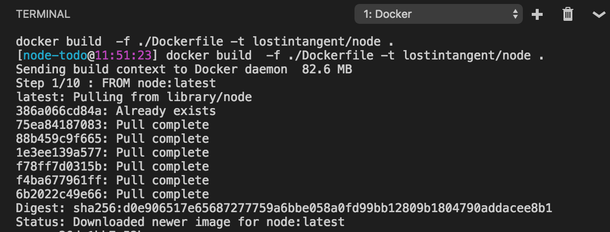 Dockerfile ができたので、実際に Docker イメージをビルドする必要があります。再び、Docker 拡張機能がインストールしたコマンドを使用できます。F1 を入力し、dockerb (「ファジー検索」を使用) と入力します。Docker: イメージをビルド コマンドを選択し、生成/編集した /Dockerfile を選択し、DockerHub ユーザー名を含むタグ (例: lostintangent/node) をイメージに付けます。<ENTER> を押すと、統合ターミナルウィンドウが起動し、Docker イメージがビルドされる出力が表示されます。