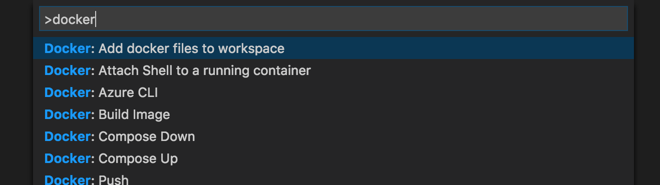 この拡張機能には多くの機能が含まれており、その1つは、既存のプロジェクトに対して Dockerfile と docker-compose.yml ファイルを生成するシンプルなコマンドです。これを実際に見てみるには、F1(コマンドパレットを起動するため)と入力し、docker と入力して、Docker 拡張機能が提供するすべてのコマンドを表示します。
