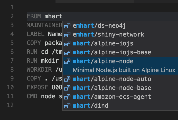 mhart の t の後にカーソルを置き、CTRL+Space を押すと、mhart が DockerHub に公開しているすべてのイメージリポジトリを表示できます。