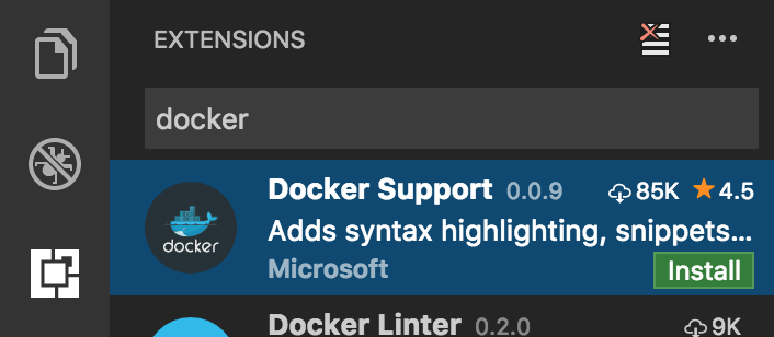 拡張機能タブに切り替え、docker を検索し、Microsoft の Docker 拡張機能を選択します。上記 Chrome 拡張機能と同様に、これをインストールしてから VS Code を再ロードします。