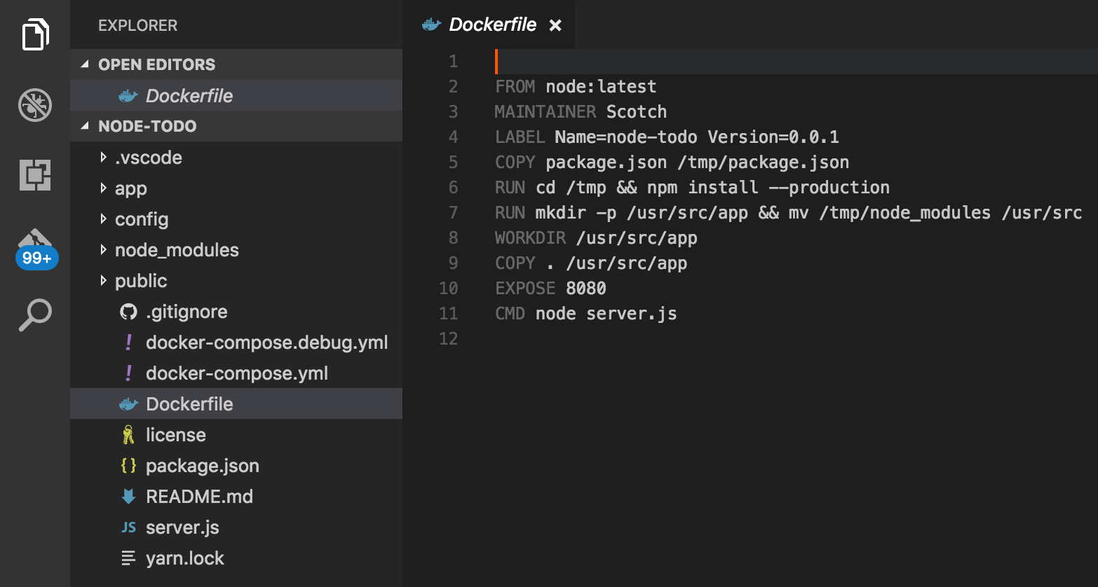 Docker 拡張機能は、Dockerfile と docker-compose.yml ファイルの自動補完も提供するため、Docker アセットの作成がはるかに簡単になります。たとえば、Dockerfile を開いて 2 行目を次のように変更します。