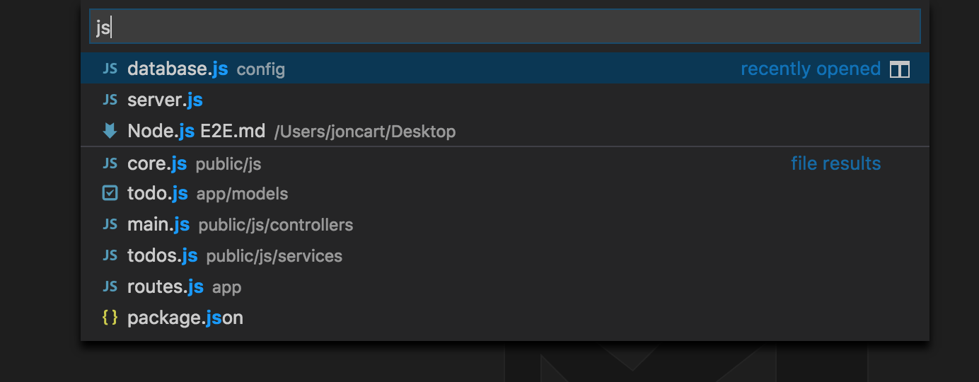 CMD+Pを入力し、.jsを入力すると、プロジェクト内のすべての JavaScript/JSON ファイルとそれらが含まれるディレクトリが表示されます。繰り返しますが、このダイアログはコマンドパレットと同じ「あいまい検索」をサポートしているため、非常に柔軟です。