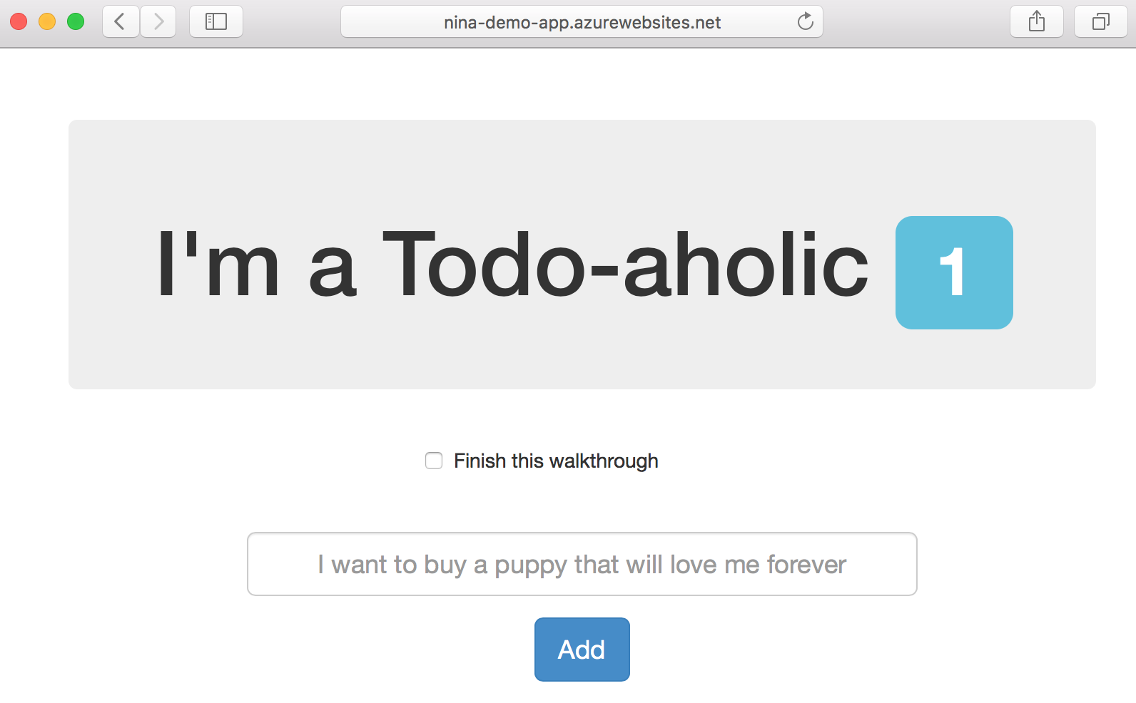 保存ボタンを押し、ブラウザに戻って更新します。Todo アイテムを追加したり削除したりして、何も変更することなくアプリが動作することを確認してください!環境変数を、完全に MongoDB データベースをエミュレートする作成済みの DocumentDB インスタンスに設定しただけです。