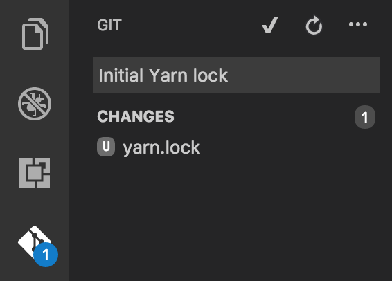 このファイルをソース管理にチェックインすることが推奨されており、これを行うには、VS Code の統合 Git タブ (Git ロゴのあるタブ) に簡単に切り替えて、新しく追加されたファイルに注目します。コミットメッセージを入力し、CMD+Enter (またはチェックマークアイコンをクリック) を押して、変更をローカルでステージング/コミットすることができます。
