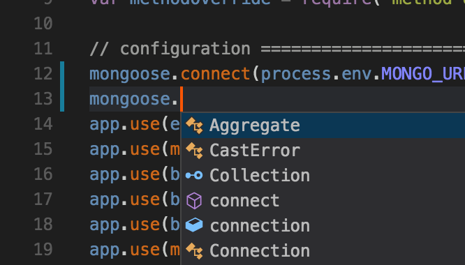 コードの作成/探索中にオートコンプリートを使用すると、ドキュメントを参照し続けたり、APIのタイプミスを心配したりする必要がなくなるため、生産性が大幅に向上します。たとえば、ハードコードされたMongoDB接続文字列を環境変数で強化するために、12行目を次のように変更します